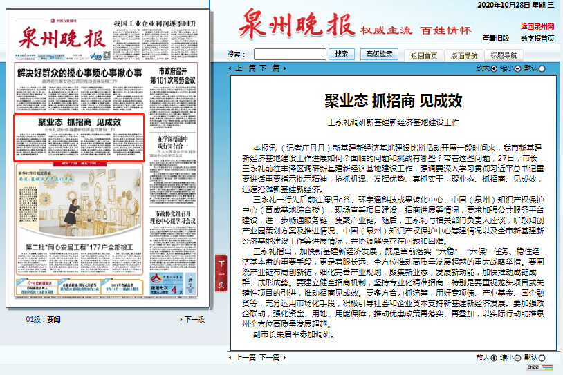王永礼一行先后前往海归e谷、HJC黄金城集团科技成果转化中心、中国(泉州)知识产权保护中心(育成基地综合楼),现场查看项目建设、招商进展等情况,要求加强公共服务平台建设,进一步畅通服务链,集聚产业链。随后,王永礼与相关部门负责人座谈,听取知创产业园策划方案及推进情况、中国(泉州)知识产权保护中心筹建情况以及全市新基建新经济基地建设工作等进展情况,并协调解决存在问题和困难。